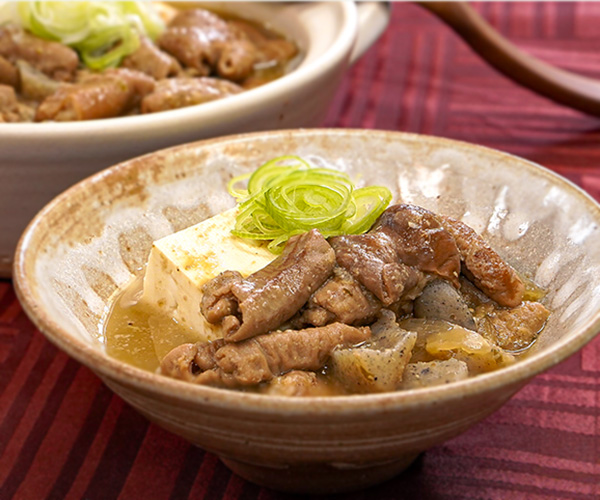 玉ねぎ、こんにゃく(湯通しする)を②の鍋に加え、煮込む。食べる直前に豆腐を入れて温める。